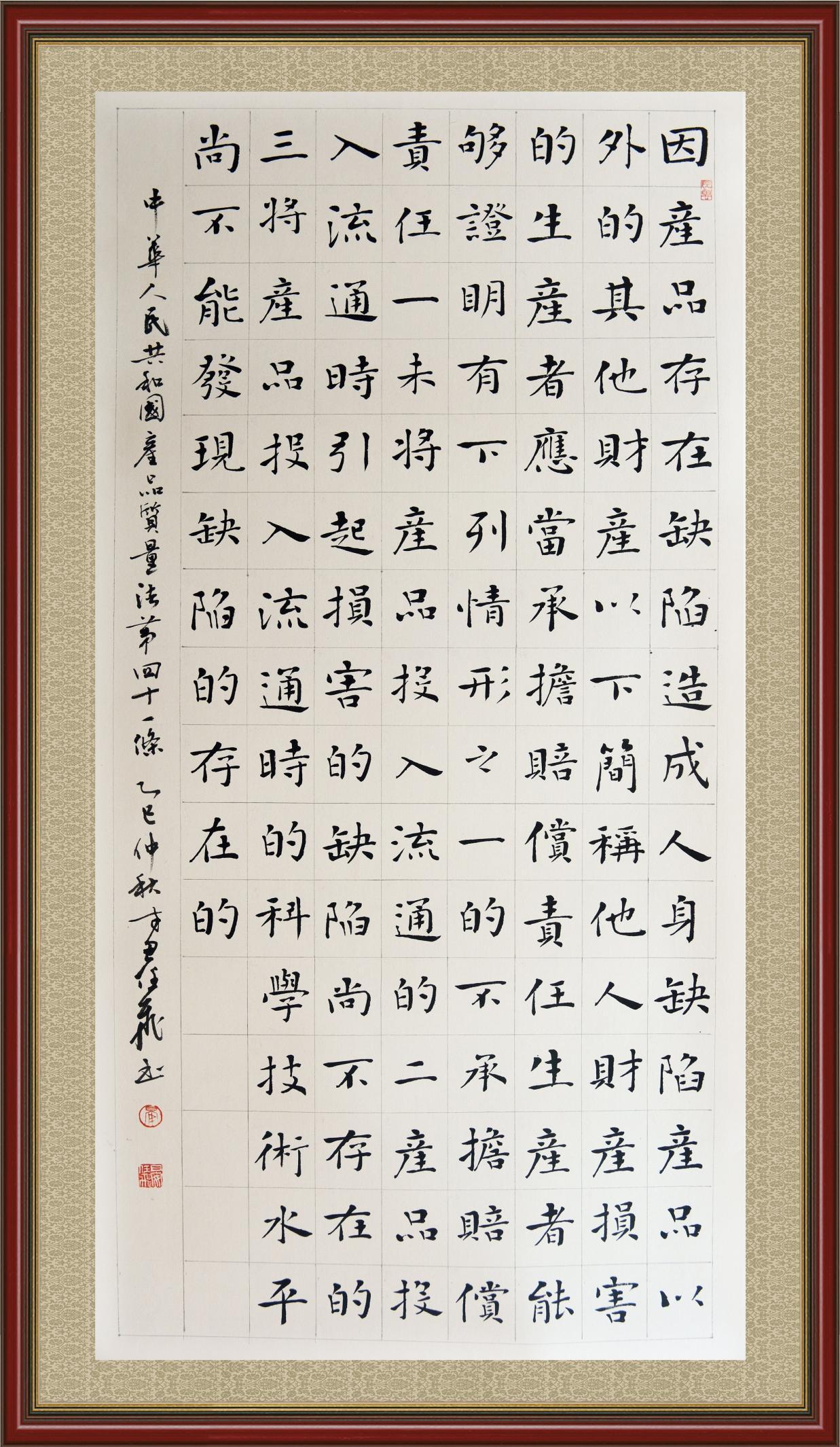 《中華人民共和國產品質量法》自1993年9月1日起開始施行,先后進行三次修正。作為產品質量領域的基本法律,產品質量法對規(guī)范產品質量管理、維護消費者合法權益、促進經濟社會發(fā)展具有重要意義。為更好地學習、宣傳、貫徹這部法律,在國家市場監(jiān)督管理總局法規(guī)司的支持下,法治日報社開展了“‘書·法’系列活動之書寫《中華人民共和國產品質量法》”活動。