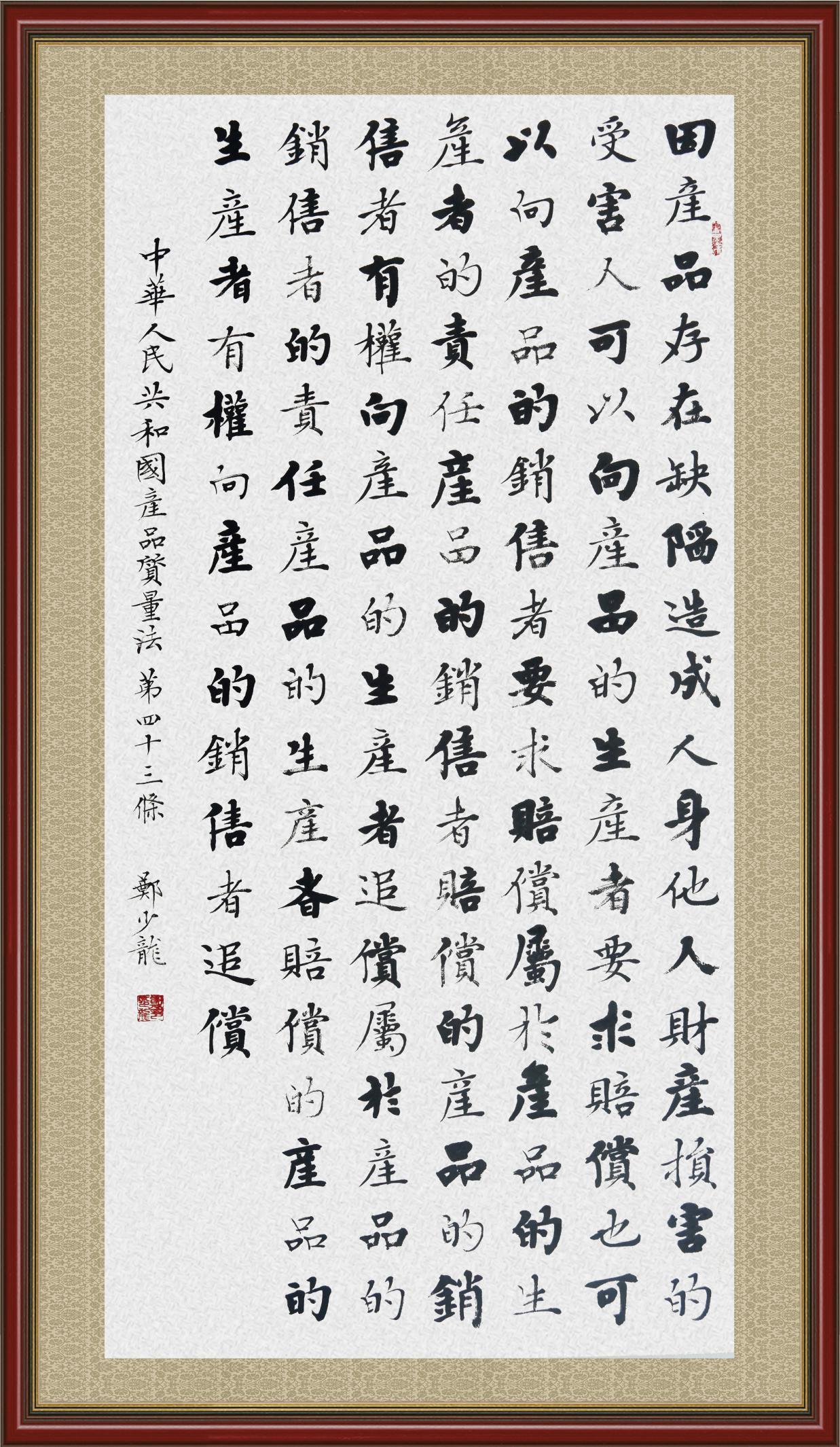 《中華人民共和國(guó)產(chǎn)品質(zhì)量法》自1993年9月1日起開始施行,先后進(jìn)行三次修正。作為產(chǎn)品質(zhì)量領(lǐng)域的基本法律,產(chǎn)品質(zhì)量法對(duì)規(guī)范產(chǎn)品質(zhì)量管理、維護(hù)消費(fèi)者合法權(quán)益、促進(jìn)經(jīng)濟(jì)社會(huì)發(fā)展具有重要意義。為更好地學(xué)習(xí)、宣傳、貫徹這部法律,在國(guó)家市場(chǎng)監(jiān)督管理總局法規(guī)司的支持下,法治日?qǐng)?bào)社開展了“‘書·法’系列活動(dòng)之書寫《中華人民共和國(guó)產(chǎn)品質(zhì)量法》”活動(dòng)。
