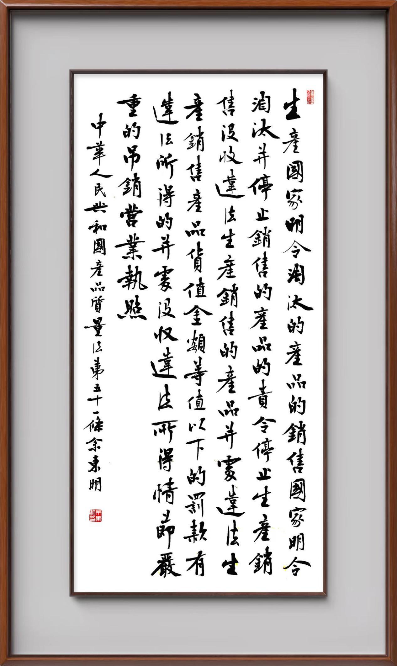 《中華人民共和國產品質量法》自1993年9月1日起開始施行,先后進行三次修正。作為產品質量領域的基本法律,產品質量法對規(guī)范產品質量管理、維護消費者合法權益、促進經濟社會發(fā)展具有重要意義。為更好地學習、宣傳、貫徹這部法律,在國家市場監(jiān)督管理總局法規(guī)司的支持下,法治日報社開展了“‘書·法’系列活動之書寫《中華人民共和國產品質量法》”活動。