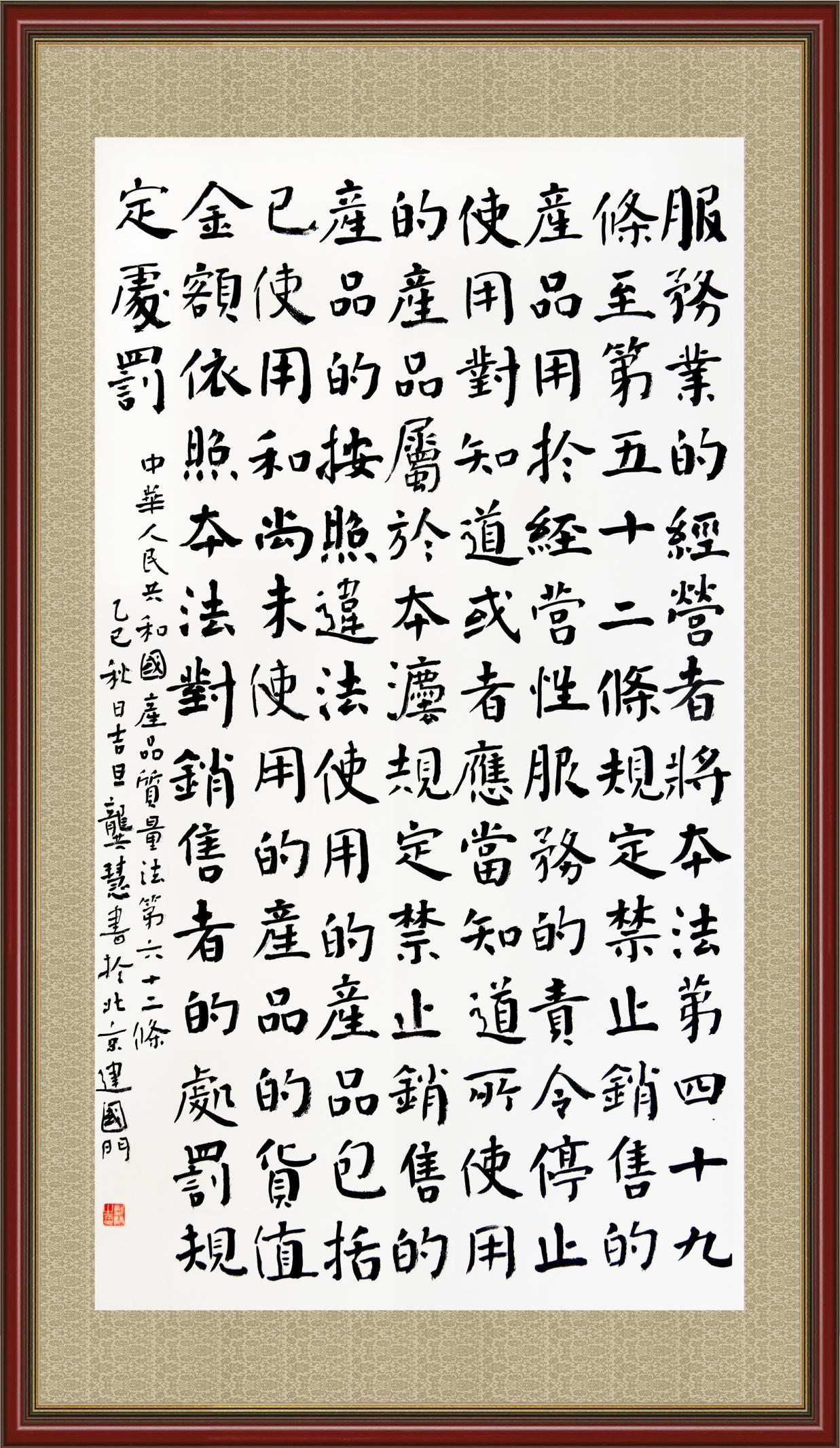 《中華人民共和國產(chǎn)品質(zhì)量法》自1993年9月1日起開始施行,先后進(jìn)行三次修正。作為產(chǎn)品質(zhì)量領(lǐng)域的基本法律,產(chǎn)品質(zhì)量法對規(guī)范產(chǎn)品質(zhì)量管理、維護(hù)消費者合法權(quán)益、促進(jìn)經(jīng)濟社會發(fā)展具有重要意義。為更好地學(xué)習(xí)、宣傳、貫徹這部法律,在國家市場監(jiān)督管理總局法規(guī)司的支持下,法治日報社開展了“‘書·法’系列活動之書寫《中華人民共和國產(chǎn)品質(zhì)量法》”活動。