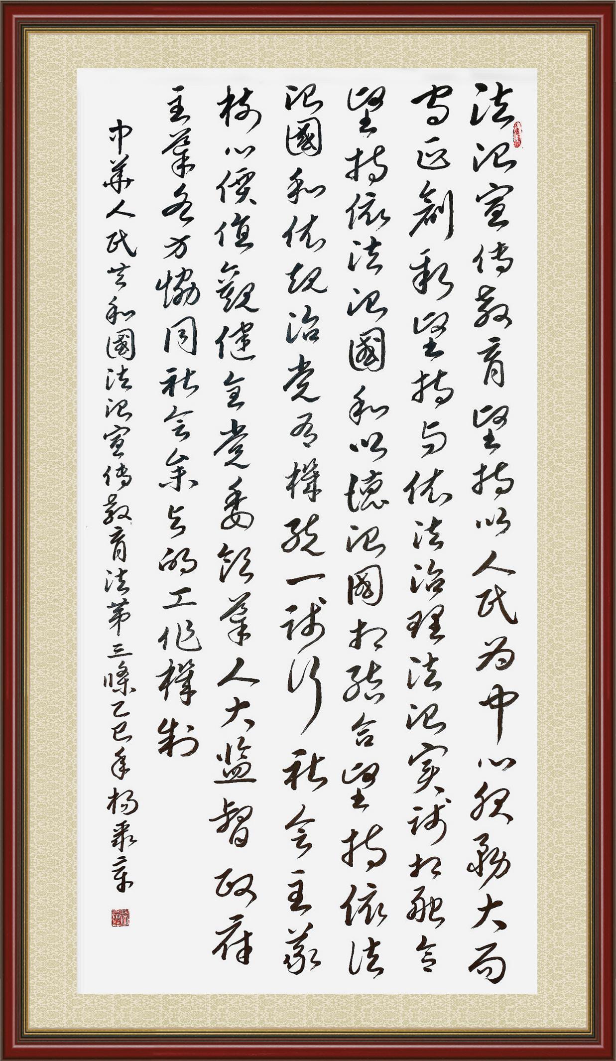 2020年7月11日,由法治日報社主辦的“書·法”系列活動正式啟動,先后書寫《中華人民共和國民法典》《中華人民共和國憲法》《中華人民共和國民營經(jīng)濟促進法》等21部法律法規(guī)。