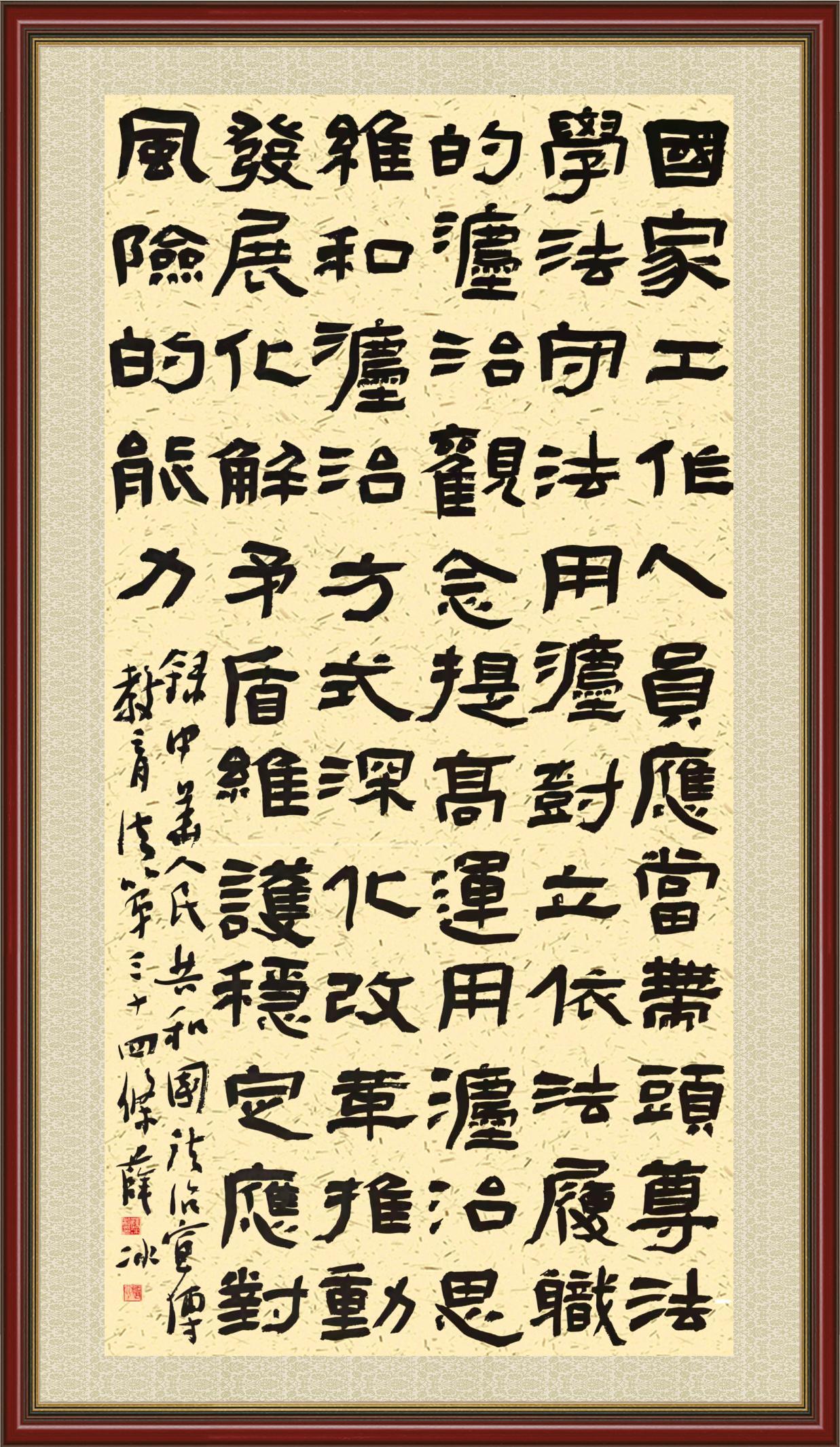 2020年7月11日,由法治日報社主辦的“書·法”系列活動正式啟動,先后書寫《中華人民共和國民法典》《中華人民共和國憲法》《中華人民共和國民營經(jīng)濟促進(jìn)法》等21部法律法規(guī)。