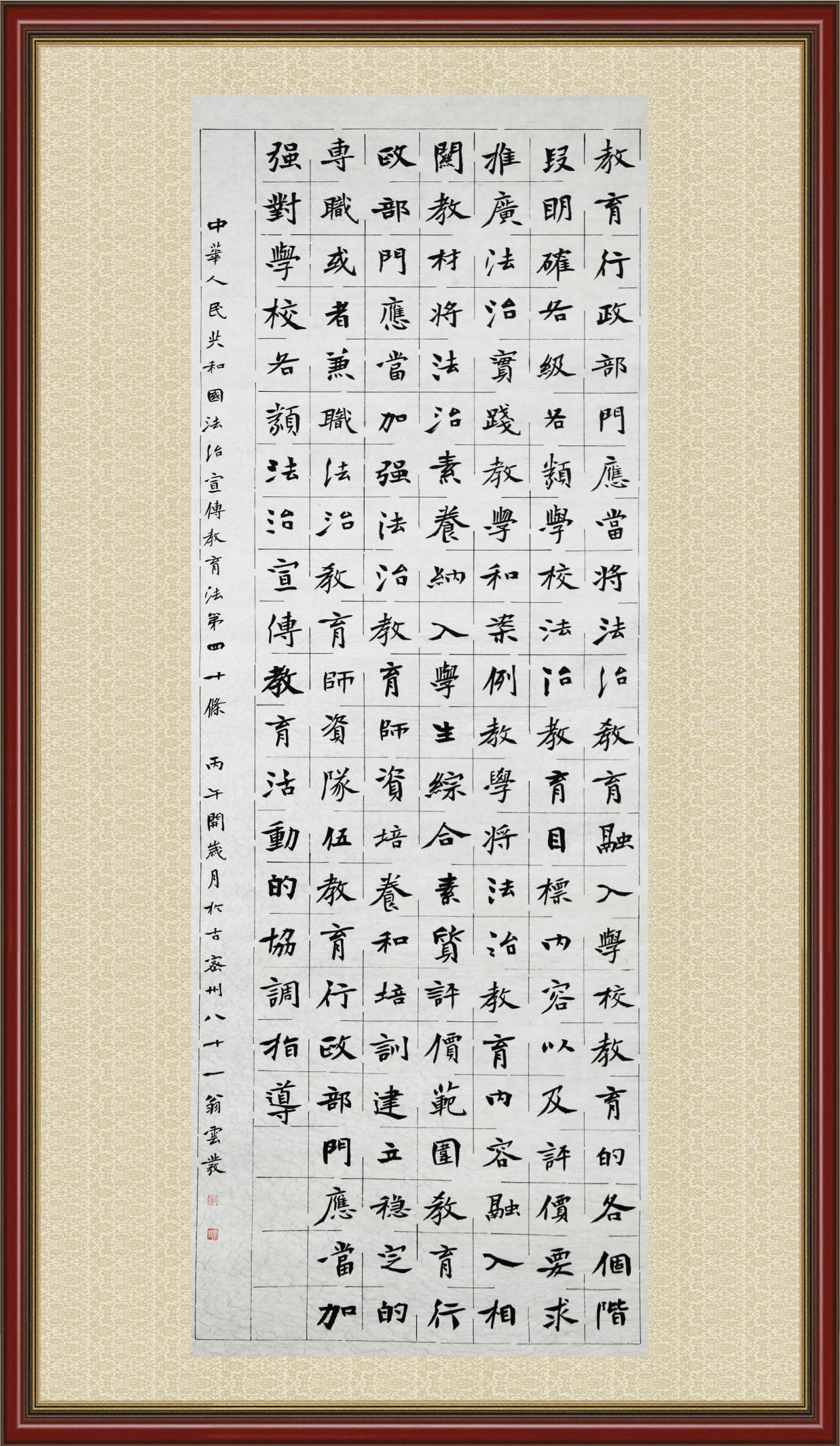 《中華人民共和國法治宣傳教育法》自2025年11月1日起開始施行。法治宣傳教育是全面依法治國的長期基礎性工作。法治宣傳教育法對提升全民法治素養(yǎng)和社會治理法治化水平、推動建設更高水平的社會主義法治國家具有重要意義。為更好地學習、宣傳、貫徹這部法律,法治日報社聯(lián)合司法部普法與依法治理局,開展了“‘書·法’系列活動之書寫《中華人民共和國法治宣傳教育法》”活動。