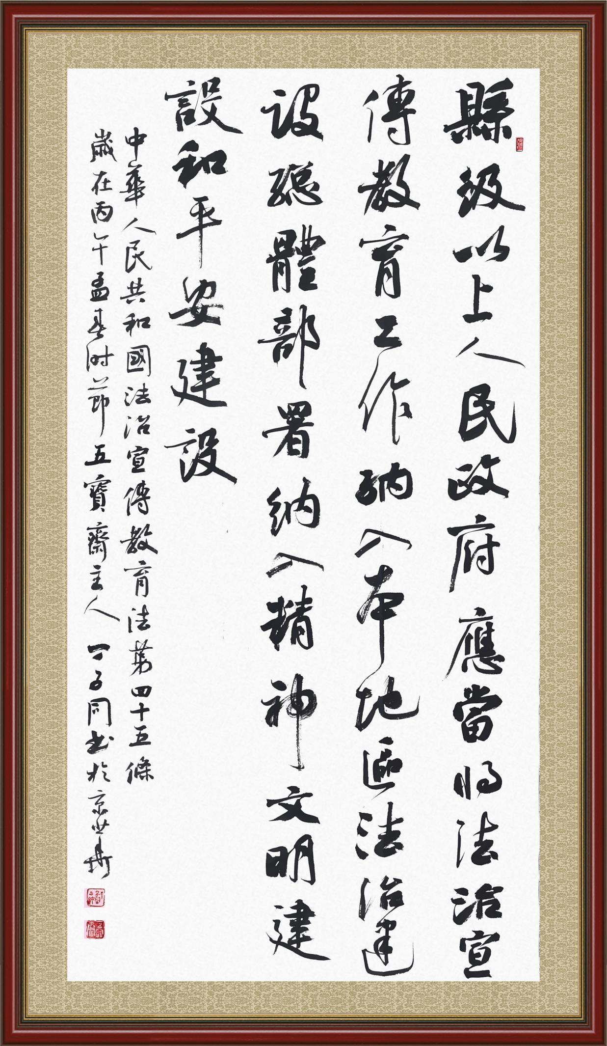 2020年7月11日,由法治日報社主辦的“書·法”系列活動正式啟動,先后書寫《中華人民共和國民法典》《中華人民共和國憲法》《中華人民共和國民營經(jīng)濟(jì)促進(jìn)法》等21部法律法規(guī)。
