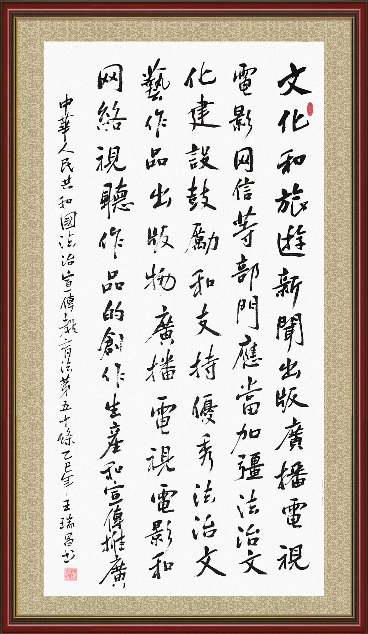 2020年7月11日,由法治日報社主辦的“書·法”系列活動正式啟動,先后書寫《中華人民共和國民法典》《中華人民共和國憲法》《中華人民共和國民營經濟促進法》等21部法律法規(guī)。