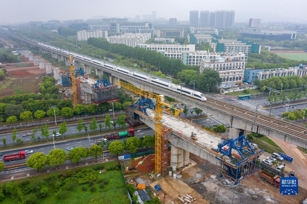 中鐵四局四公司的工程人員在江蘇南沿江城際鐵路站前Ⅰ標(biāo)工程跨天元東路連續(xù)梁施工點施工作業(yè)(2021年4月27日攝,無人機照片)。新華社記者 李博 攝