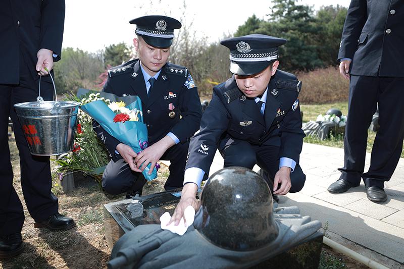 圖為公安民警代表擦拭墓碑,敬獻(xiàn)鮮花,表達(dá)對(duì)烈士的哀思。