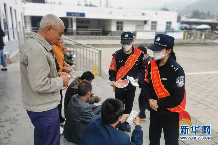 黔江站站前廣場,鐵路民警向旅客宣傳國家安全知識和防范電信網(wǎng)絡(luò)詐騙常識。新華網(wǎng)發(fā)(徐玲玲 攝)