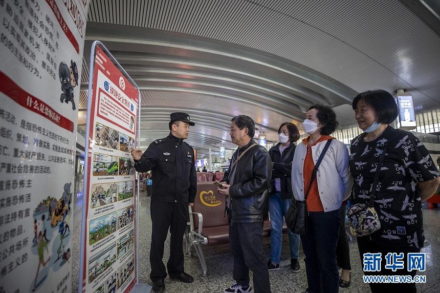 在重慶北站、重慶西站、萬州北站等鐵路樞紐車站,重慶鐵路警方聯(lián)合屬地公安機關(guān)、車站管委會、鐵路企業(yè)等單位,組織民警、職工在站前廣場、候車大廳等旅客較多的地方,宣講鐵路安全常識、電信詐騙、反邪教等知識,引導(dǎo)廣大旅客增強國家安全意識。