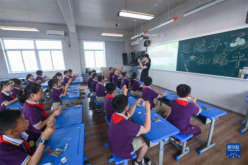 6月8日,學(xué)生們在傳統(tǒng)習(xí)俗課上學(xué)習(xí)包粽子。
