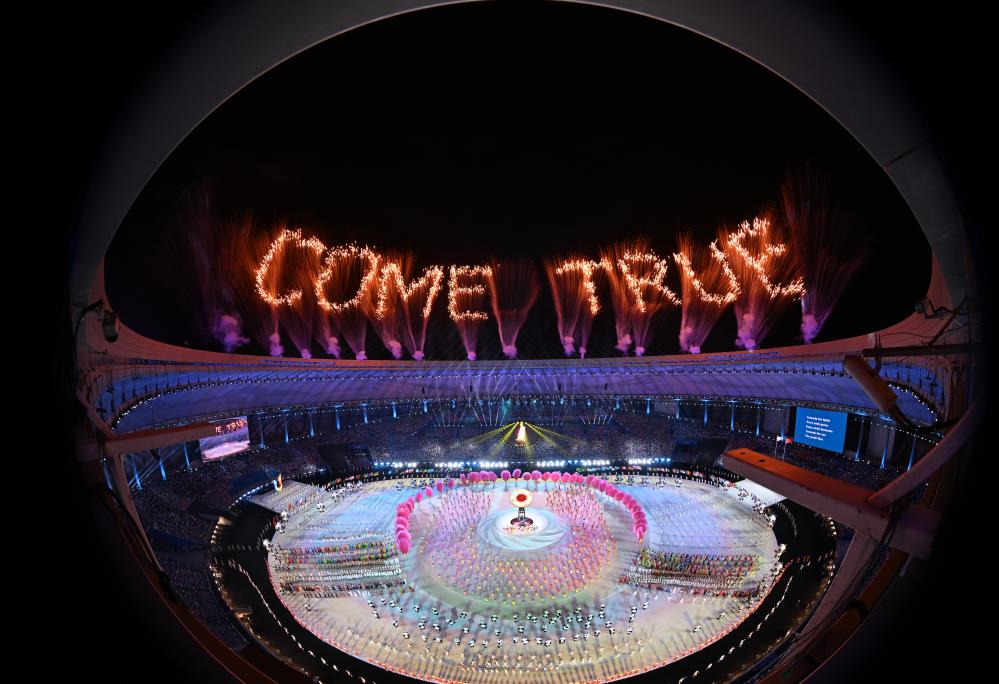 成都成就夢想。隨著大運(yùn)會火炬塔被點(diǎn)燃,焰火在空中打出成都大運(yùn)會的U形會徽,體育場上空焰火呈現(xiàn)英文字樣“Make Dreams Come True”。
