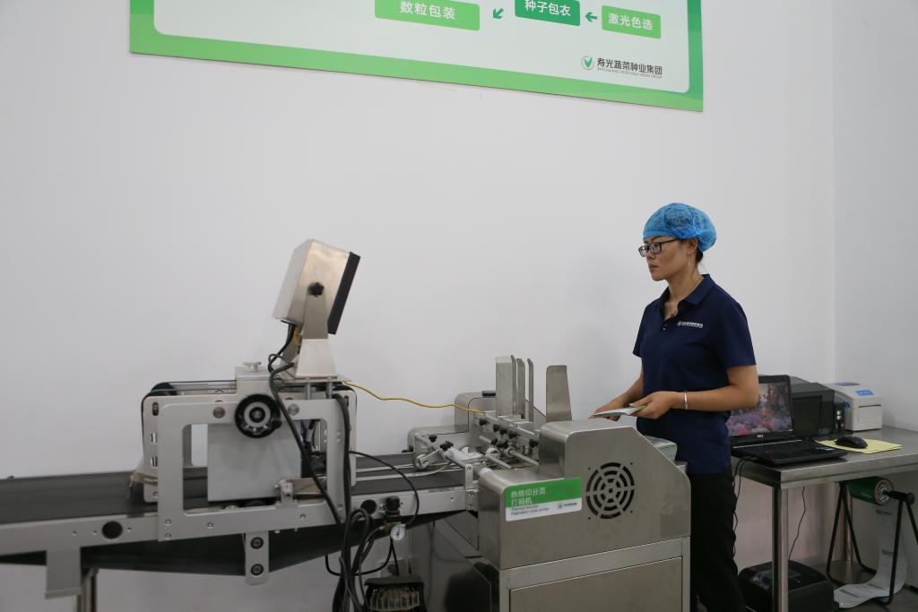 7月26日,山東壽光蔬菜種業(yè)集團(tuán)工人在包裝車(chē)間給種子包裝袋打碼。(新華社記者張浩波 攝)