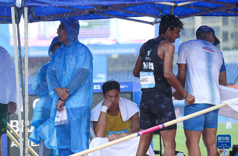 8月3日,中國選手陳業(yè)森在男子十項全能撐竿跳高比賽因雨中斷后離開賽場。新華社記者 李京 攝