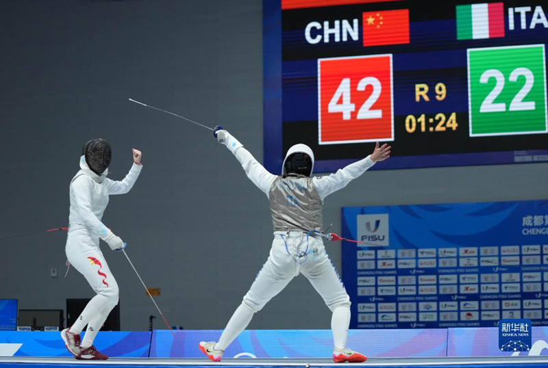 當(dāng)日,在成都舉行的第31屆世界大學(xué)生夏季運(yùn)動(dòng)會(huì)擊劍女子花劍團(tuán)體金牌賽中,中國(guó)隊(duì)以45比22戰(zhàn)勝意大利隊(duì),獲得金牌。