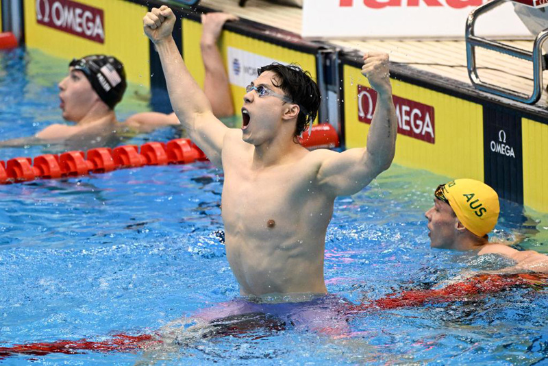 7日,成都大運(yùn)會(huì)游泳項(xiàng)目收官日上,覃海洋帶領(lǐng)中國隊(duì)站上男子4X100米混合泳接力賽的最高領(lǐng)獎(jiǎng)臺(tái)。覃海洋的成都大運(yùn)會(huì)個(gè)人收獲定格在5金。