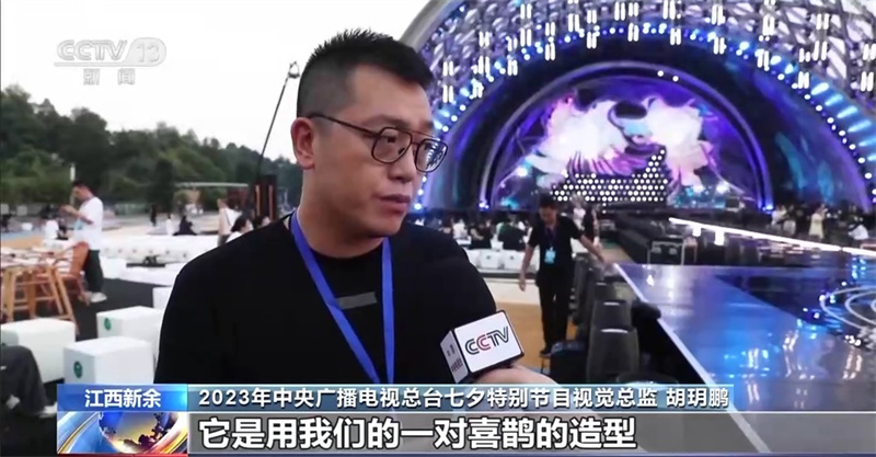 2023年中央廣播電視總臺七夕特別節(jié)目視覺總監(jiān) 胡玥鵬:整個主舞臺的LED屏,用一對喜鵲的造型來作為主造型,每個節(jié)目都要依據(jù)我們現(xiàn)在舞美的造型來做設計。同時我們設計了一個新媒體互動裝置的樹,來作為整個舞臺的前景,它既承載著一個表演空間,又有很好的一個寓意。