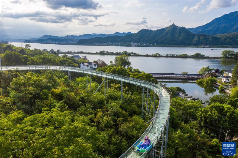8月19日,游客在三都漁村體驗星空水滑道特色項目(無人機照片)。