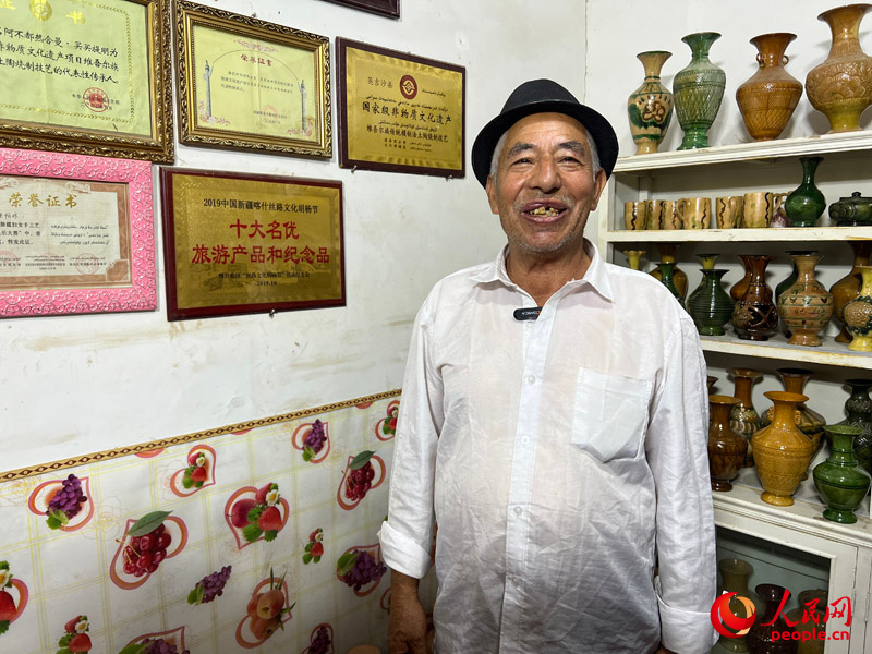 國家級非物質(zhì)文化遺產(chǎn)模制法土陶燒制技藝傳承人阿卜杜熱合曼·麥麥提敏為記者介紹他獲得的榮譽。人民網(wǎng)記者 常雪梅攝