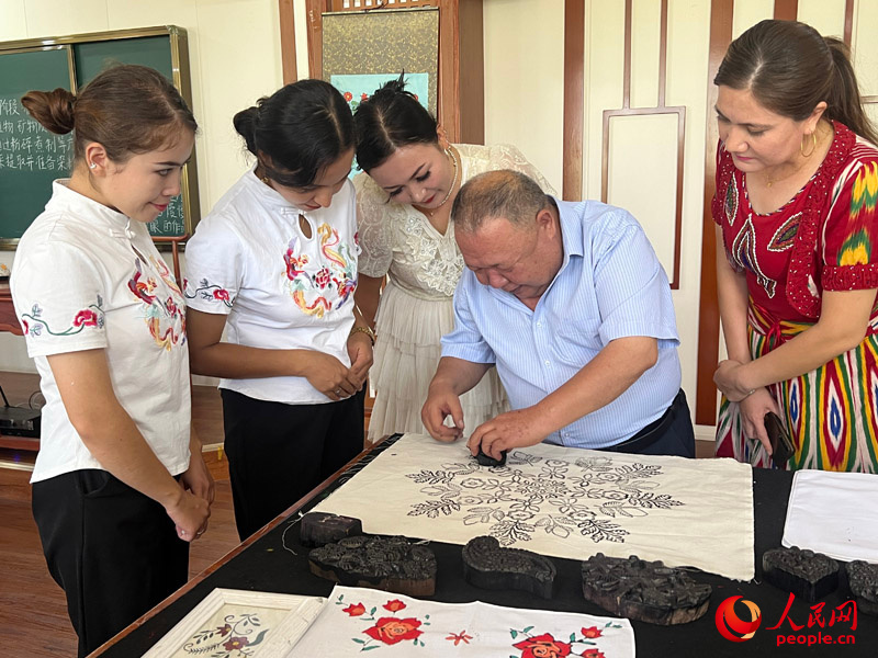國家級非物質(zhì)文化遺產(chǎn)模戳印花布技藝傳承人吾吉阿西木·吾舒爾展示模戳印花布的制作過程。人民網(wǎng)記者 常雪梅攝