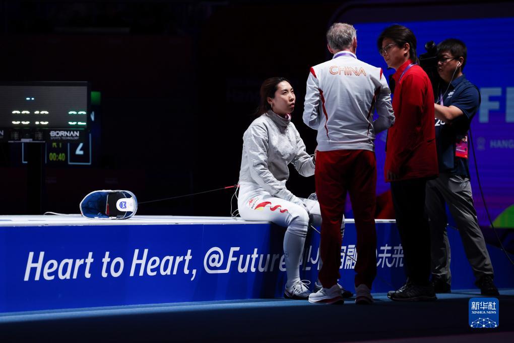 9月26日,中國選手邵雅琦(左一)在比賽間隙與教練交流。