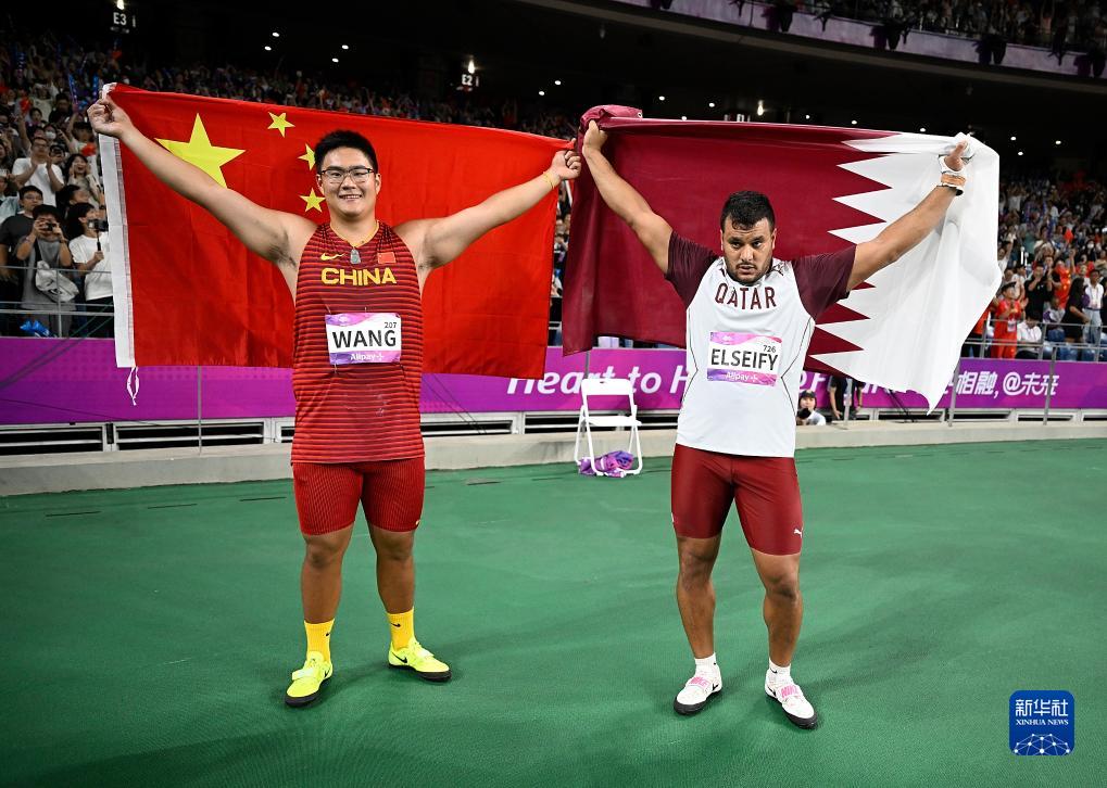 9月30日,中國(guó)選手王琦(左)和卡塔爾選手阿什拉夫·賽菲在比賽后慶祝。