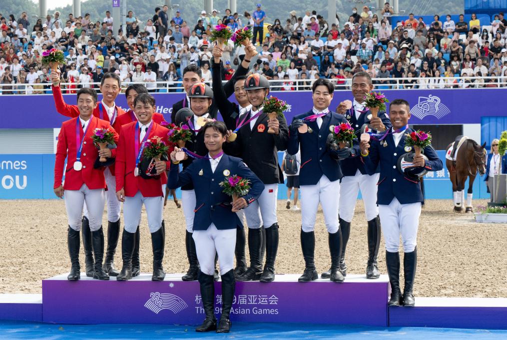 10月2日,在桐廬馬術(shù)中心舉行的杭州亞運會馬術(shù)項目三項賽團體賽結(jié)束。中國隊獲得冠軍,日本隊和泰國隊分獲亞軍、季軍。新華社記者 魏培全 攝