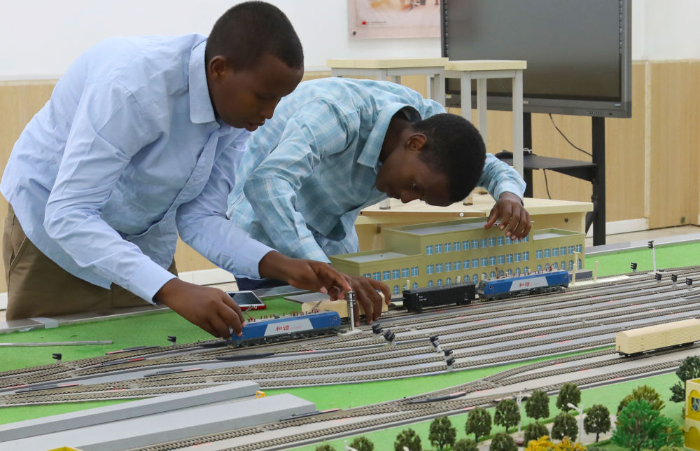 在位于吉布提首都吉布提市的吉布提工商學(xué)校,學(xué)生在魯班工坊鐵道運營沙盤教學(xué)區(qū)學(xué)習(xí)(2022年9月19日攝)。新華社記者 董江輝 攝