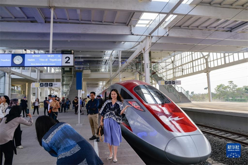 10月17日,在印度尼西亞萬隆德卡魯爾站,乘客在站臺(tái)上和雅萬高鐵高速動(dòng)車組列車合影。新華社記者 徐欽 攝