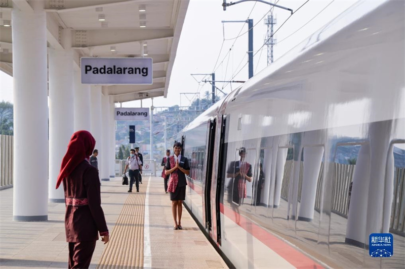 10月17日,在印度尼西亞雅加達(dá)哈利姆站,乘務(wù)人員在站臺(tái)歡迎乘客。新華社記者 徐欽 攝
