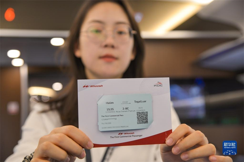 10月17日,乘客在行駛中的雅萬高鐵高速動(dòng)車組列車車廂內(nèi)展示紀(jì)念車票。新華社記者 徐欽 攝