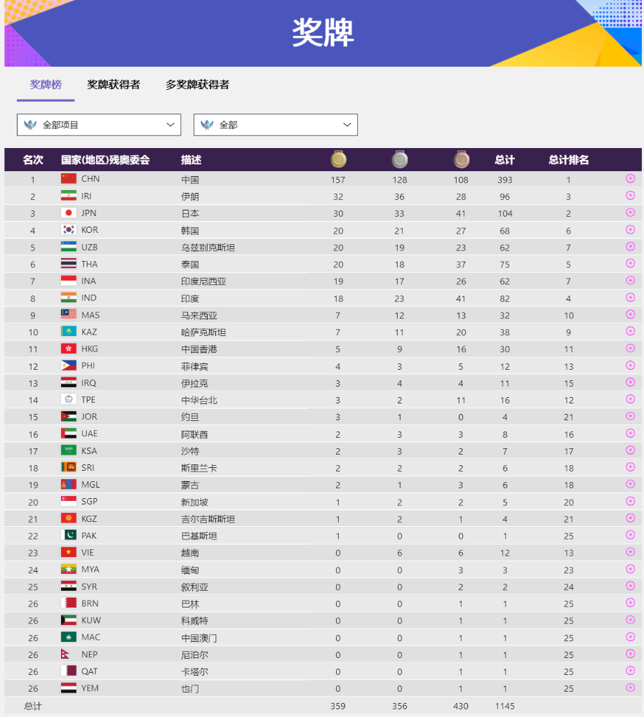 截至26日,中國隊在獎牌榜上以157金128銀108銅高居榜首,伊朗隊和日本隊分別以32金和30金排在二、三位。