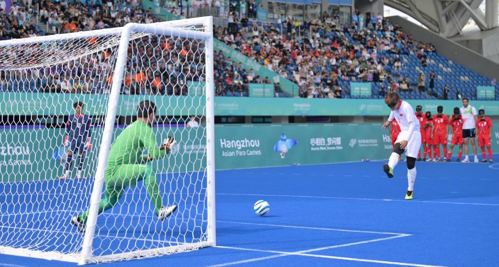 10月28日,中國(guó)隊(duì)球員劉猛(中)在盲人足球決賽中射門(mén),中國(guó)隊(duì)在點(diǎn)球大戰(zhàn)中以2:1戰(zhàn)勝伊朗隊(duì)奪冠。新華社記者才揚(yáng)攝