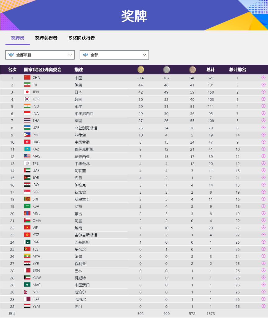 金牌大戶田徑當(dāng)天共決出15枚金牌,中國(guó)隊(duì)斬獲其中5枚,以46金43銀33銅的戰(zhàn)績(jī)穩(wěn)居首位。伊朗和印度分別以21金和18金排名第二、第三。