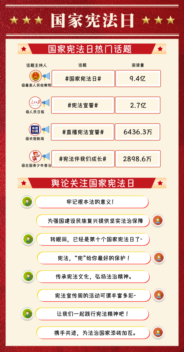 在第十個(gè)國家憲法日到來之際,多方積極宣傳相關(guān)信息,形成了多渠道、深層次的傳播格局,為弘揚(yáng)憲法精神創(chuàng)造良好輿論氛圍?!?國家憲法日#”“#憲法宣誓#”等微博熱門話題閱讀量分別達(dá)到9.4億余次、2.7億余次?!稗D(zhuǎn)眼間,已經(jīng)是第十個(gè)國家憲法日了”“傳承憲法文化,弘揚(yáng)法治精神”“攜手共進(jìn),為法治國家添磚加瓦”等網(wǎng)民留言高居評論區(qū)前排。