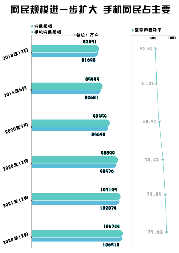 截至 2022 年 12 月,我國網(wǎng)民規(guī)模為 10.67 億, 互聯(lián)網(wǎng)普及率達(dá) 75.6%,其中,我國手機(jī)網(wǎng)民規(guī)模為 10.65 億,占整體網(wǎng)民規(guī)模的 99.8%。