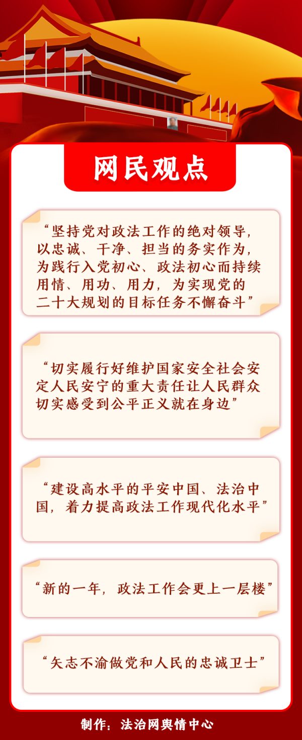 網(wǎng)民期待開啟新時(shí)代政法工作發(fā)展新篇章。不少網(wǎng)民在“中央政法委長安劍”等政法機(jī)關(guān)官微留言,認(rèn)為會議對政法工作的重要部署句句關(guān)于公正、深入人心。多數(shù)網(wǎng)民對全國政法機(jī)關(guān)有效維護(hù)國家安全、社會安定、人民安寧的付出表示感謝,期待推進(jìn)建設(shè)更高水平的平安中國、法治中國;部分網(wǎng)民向守護(hù)公平正義、維護(hù)社會穩(wěn)定而犧牲的政法干警致敬;少數(shù)網(wǎng)民結(jié)合政法系統(tǒng)違紀(jì)違法典型案例,呼吁在從嚴(yán)正風(fēng)肅紀(jì)上緊抓不放,建設(shè)高素質(zhì)政法鐵軍。