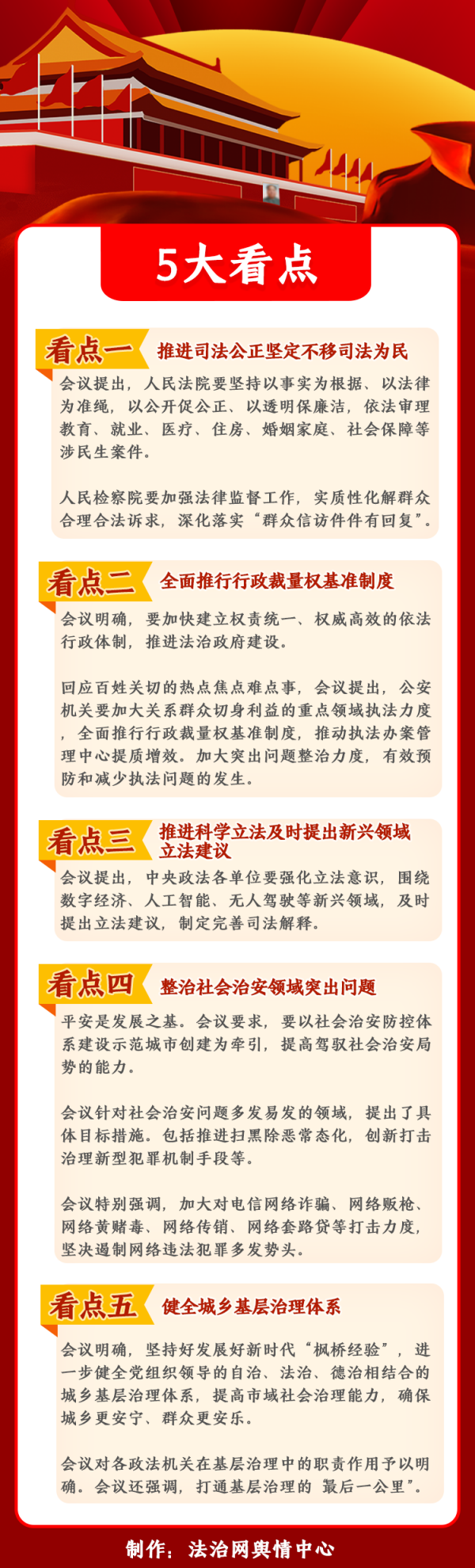 根據(jù)新華網(wǎng)發(fā)布的文章,本次會議聚焦2023年政法工作五大看點(diǎn):推進(jìn)公正司法,堅(jiān)定不移司法為民;全面推行行政裁量權(quán)基準(zhǔn)制度;推進(jìn)科學(xué)立法及時(shí)提出新興領(lǐng)域立法建議;整治社會治安領(lǐng)域突出問題;健全城鄉(xiāng)基層治理體系。