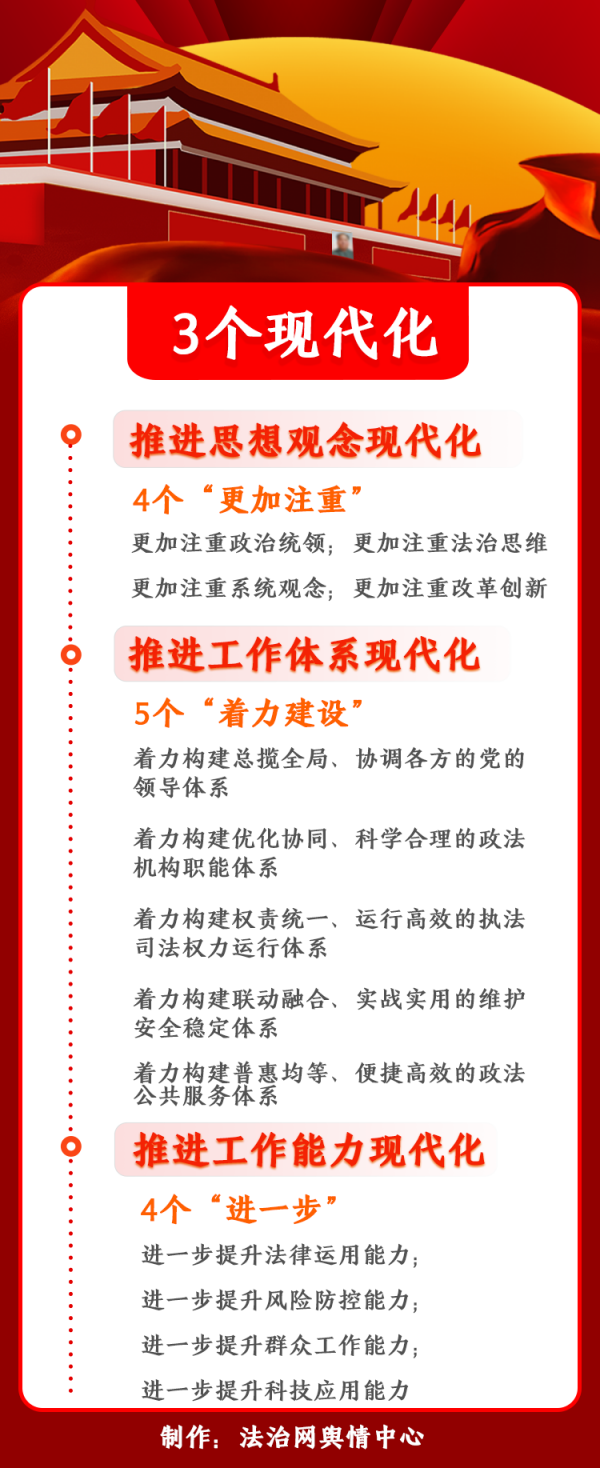 據(jù)法治網(wǎng)報(bào)道,本次會議提出要推進(jìn)政法工作三個(gè)現(xiàn)代化:推進(jìn)思想觀念現(xiàn)代化;推進(jìn)工作體系現(xiàn)代化;推進(jìn)工作能力現(xiàn)代化。