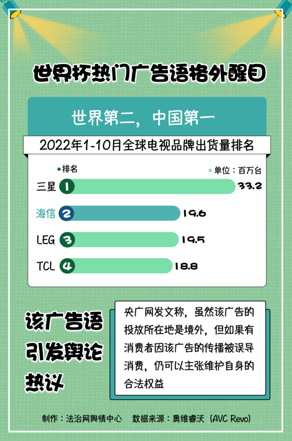 本屆世界杯不乏中國元素,其中,海信“中國第一,世界第二”的廣告語引發(fā)了輿論熱議。而熱議的焦點,一方面在于廣告語中的排名是否有據可循;另一方面,該標語是否涉嫌違法。