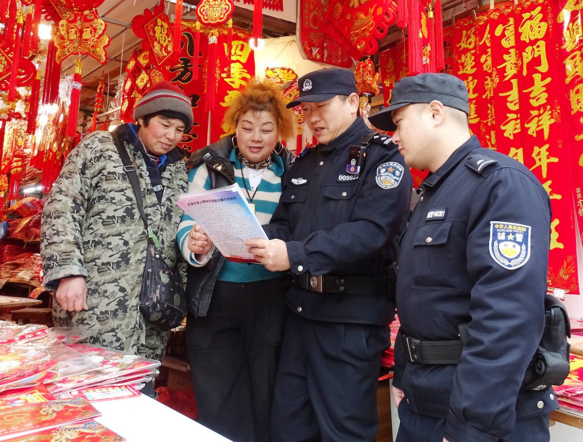 1月17日,安徽省蕪湖市公安局鏡湖分局濱江派出所民輔警在轄區(qū)年貨市場(chǎng)走訪群眾并宣傳安全防范知識(shí),提高大家的安全防范意識(shí)。