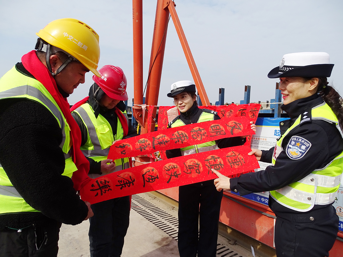 1月16日,安徽省蕪湖市公安局交警支隊鏡湖大隊組織開展“書寫春聯(lián)話平安”活動,民警走進(jìn)轄區(qū)一處建筑工地現(xiàn)場書寫富含交通安全知識、新春祝福等內(nèi)容的春聯(lián)贈給工人,讓大家在歡樂中不忘自覺遵守交通法規(guī)。