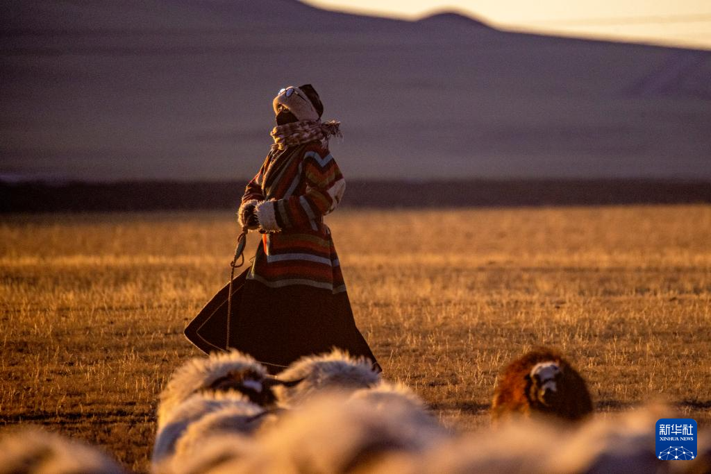 丹增在尼瑪縣俄久鄉(xiāng)馬遷村老家的草場上牧羊(2023年12月18日攝)。