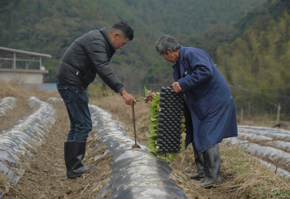 羅小平(左)和父親一起搶栽煙苗。新華社記者李昊澤 攝