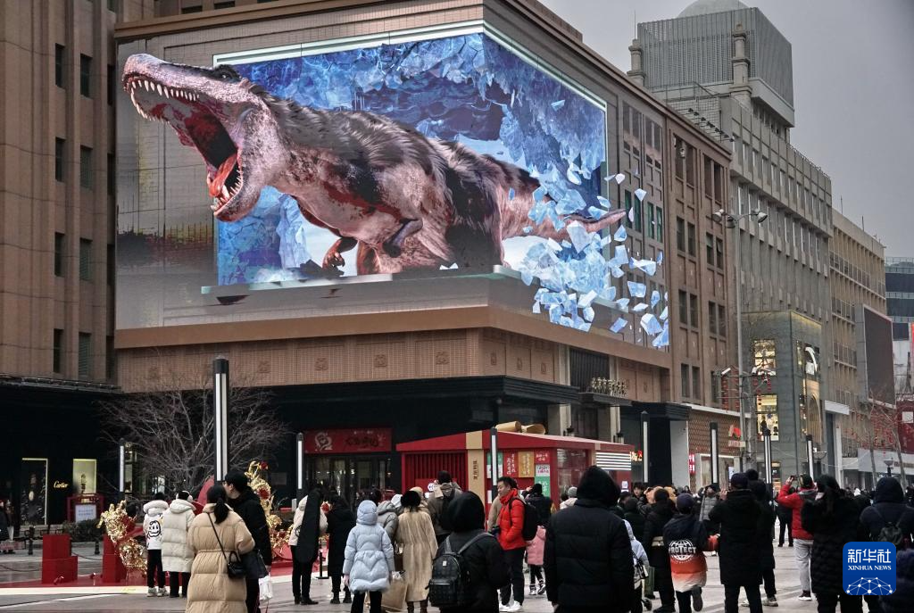 市民在王府井商業(yè)街觀看裸眼3D大屏幕的動畫(2月2日攝)。