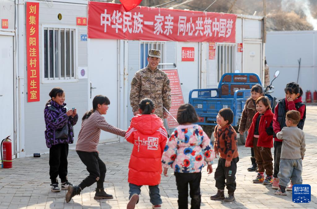 在甘肅省積石山縣陽洼村,武警甘肅總隊(duì)臨夏支隊(duì)?wèi)?zhàn)士和小朋友做游戲(1月30日攝)。新華社發(fā)(侯崇慧 攝)