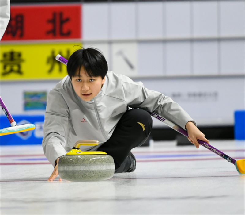 貴州隊隊員在比賽中擲壺。