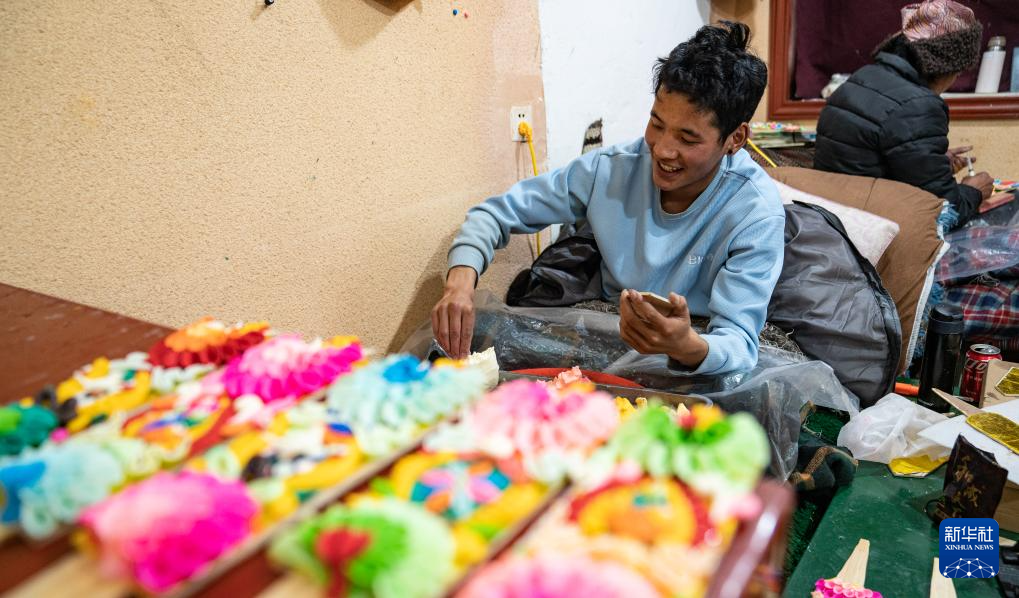2月7日,在拉薩八廓商城,手工藝人在制作酥油花。