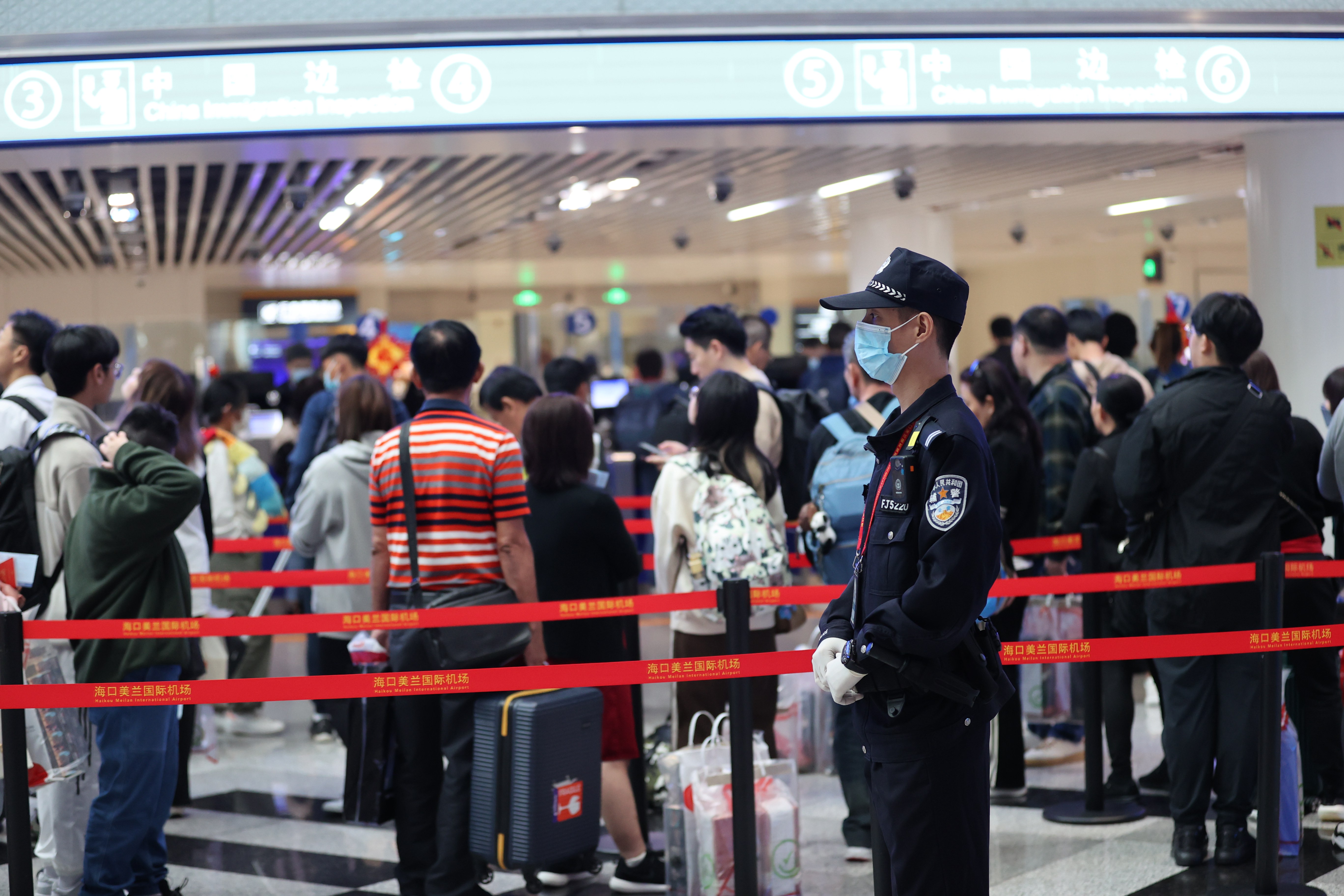 2月10日,正值大年初一。上午10時許,兩架從新加坡入境海南??诘暮桨酀M載著286名旅客相繼飛抵??诿捞m國際機場,美蘭出入境邊防檢查站執(zhí)勤四隊的執(zhí)勤民警又開始忙碌起來。