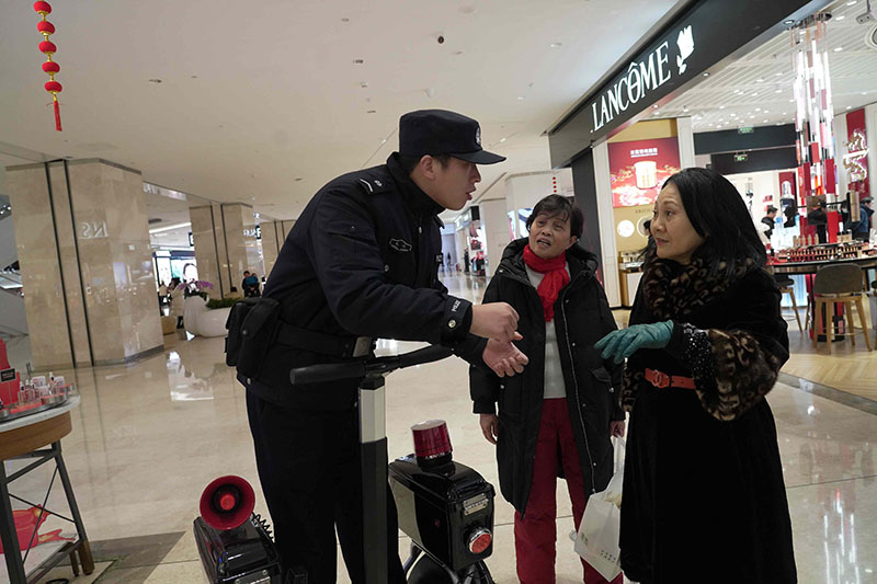 春節(jié)期間,湖北省武漢市公安局武昌區(qū)分局梅苑派出所民警肖楠和同事用心守護(hù)武商夢(mèng)時(shí)代廣場(chǎng)的平安。