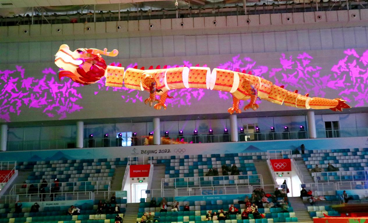 在水立方奧林匹克比賽大廳上空,30米長的巨龍配合現(xiàn)場聲光電效果,從場館水面騰升而起,“若空游無所依”的巨龍景觀與奧林匹克中心區(qū)龍形水系遙相呼應,吉祥寓意氛圍感瞬間拉滿。
